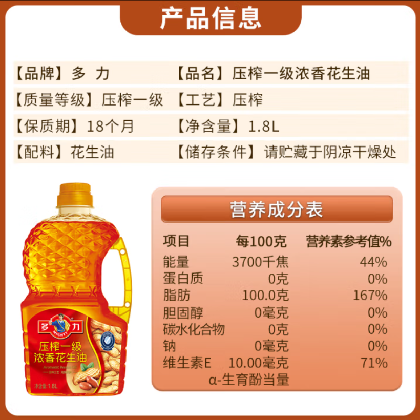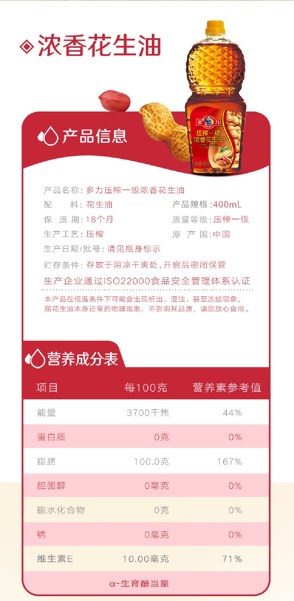 多力(MIGHTY) 压榨一级浓香花生油400ml 食用油小包装油